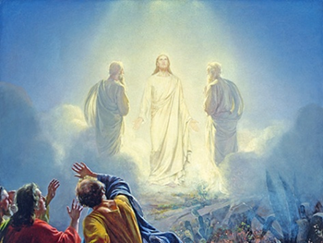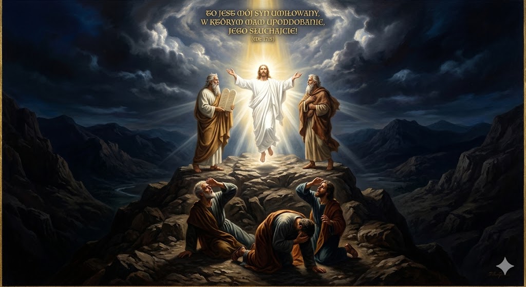 Jezus wziął z sobą Piotra, Jakuba oraz brata jego, Jana, i zaprowadził ich na górę wysoką, osobno. Tam przemienił się wobec nich: twarz Jego zajaśniała jak słońce, odzienie zaś stało się białe jak światło. A oto ukazali się im Mojżesz i Eliasz, rozmawiający z Nim. Wtedy Piotr rzekł do Jezusa: „Panie, dobrze, że tu jesteśmy; jeśli chcesz, postawię tu trzy namioty: jeden dla Ciebie, jeden dla Mojżesza i jeden dla Eliasza”. Gdy on jeszcze mówił, oto obłok świetlany osłonił ich, a z obłoku odezwał się głos: „To jest mój Syn umiłowany, w którym mam upodobanie, Jego słuchajcie!” Uczniowie, słysząc to, upadli na twarz i bardzo się zlękli. A Jezus zbliżył się do nich, dotknął ich i rzekł: „Wstańcie, nie lękajcie się!» Gdy podnieśli oczy, nikogo nie widzieli, tylko samego Jezusa. A gdy schodzili z góry, Jezus przykazał im, mówiąc: «Nie opowiadajcie nikomu o tym widzeniu, aż Syn Człowieczy zmartwychwstanie”.