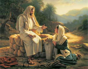 Jezus przybył do miasta samarytańskiego zwanego Sychar, w pobliżu pola, które dał Jakub synowi swemu, Józefowi. Było tam źródło Jakuba. Jezus zmęczony drogą siedział sobie przy źródle. Było to około szóstej godziny. Wówczas nadeszła kobieta z Samarii, aby zaczerpnąć wody. Jezus rzekł do niej: „Daj Mi pić!” Jego uczniowie bowiem udali się przedtem do miasta, by zakupić żywności. Na to rzekła do Niego Samarytanka: „Jakżeż Ty, będąc Żydem, prosisz mnie, Samarytankę, bym Ci dała się napić?” Żydzi bowiem i Samarytanie unikają się nawzajem. Jezus odpowiedział jej na to: „O, gdybyś znała dar Boży i wiedziała, kim jest Ten, kto ci mówi: „Daj Mi się napić”, to prosiłabyś Go, a dałby ci wody żywej”. Powiedziała do Niego kobieta: „Panie, nie masz czerpaka, a studnia jest głęboka. Skądże więc weźmiesz wody żywej? …